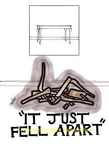 The story of “It just fell apart” begins at my former neighbors’ house in Tucson, Arizona. The neighbor had had a small wooden table sitting outside the house for months on end, deteriorating in the ever-changing temperature and humidity and looking more rickety every day. One morning, I saw that the pieces of the little table had been piled at the curb for Big Trash Day.