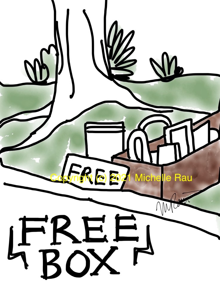Free Box says: it’s good to be generous, and it’s good to know the difference between trash and treasure. It’s good to reduce the number of my possessions, to de-clutter and donate on a regular basis, to keep life simpler and cleaner. I must wisely spend energy on managing my possessions: choosing them, maintaining them, storing them, and disposing of them.