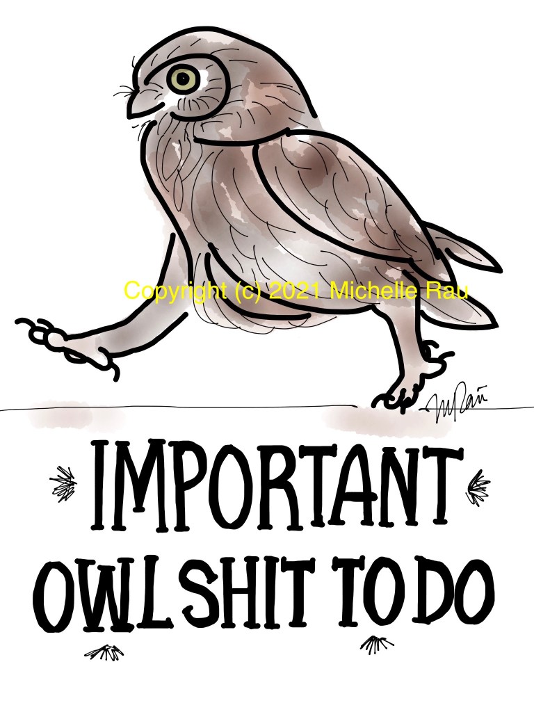 I am far too serious, and take myself far too seriously. My perspective is skewed, and I need to get my head back on straight. I attach a lot more importance to stupid shit than I should. And, I can’t possibly accomplish everything on my to-do list. So I should save my important owl shit for the tasks that really matter.