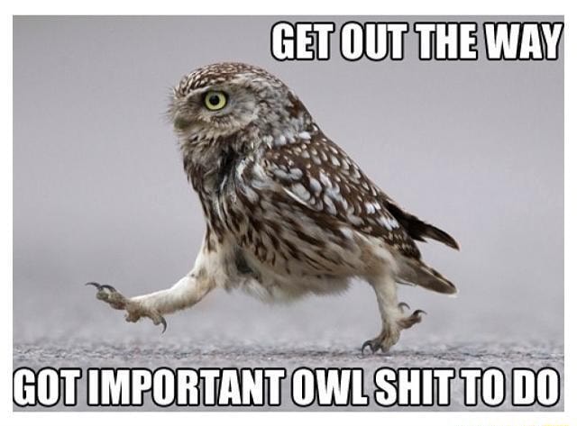 I think the owl looks like it is striding along at a furious clip, ready to kick ass. The focus, the expression, the fast pace—that’s all me, when I’m concentrating on getting shit done. And this owl reminds me of just how absurd it is for me to be so focused on things that seem so important in the moment….but are actually very trivial, in the grand scheme of things. Further heightening the absurdity, owls don’t run, they fly, and the grammar is wrong, but the meme still absolutely succeeds in its message.