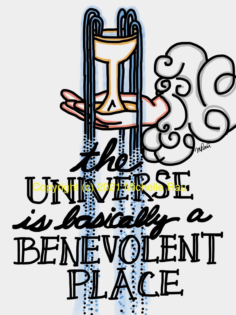 The origin story of The Universe is Basically a Benevolent Place is shrouded in the mists of time. But I want to say it began with a former partner, who tried to soothe my fears and help me become a more intrepid adventurer. I learned that more people are generally more accepting and more tolerant, generous and kind than I had been giving them credit for. We were choosing the people around us as wisely as we could, and the odds were in our favor.