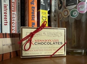 I keep the empty truffle box on my bookshelf to remind me to stay honest, and continually strive to be a better and more generous person. I now believe that, at the Missionary Chocolates shop, I was in the presence of an angel and didn’t even know it.