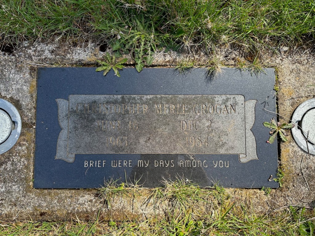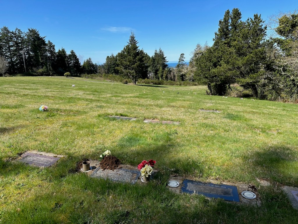 Yesterday I drove to the cemetery where Chris is buried. The nice woman in the office steered me to the right area. I wandered around a bit, eventually using her directions plus GPS coordinates from findagrave.com to find Chris’s stone marker. From his resting place, one can barely see the surf of the ocean. I’d rather have Chris alive in the real world, but if he has to be dead, this is a pretty nice place to be.