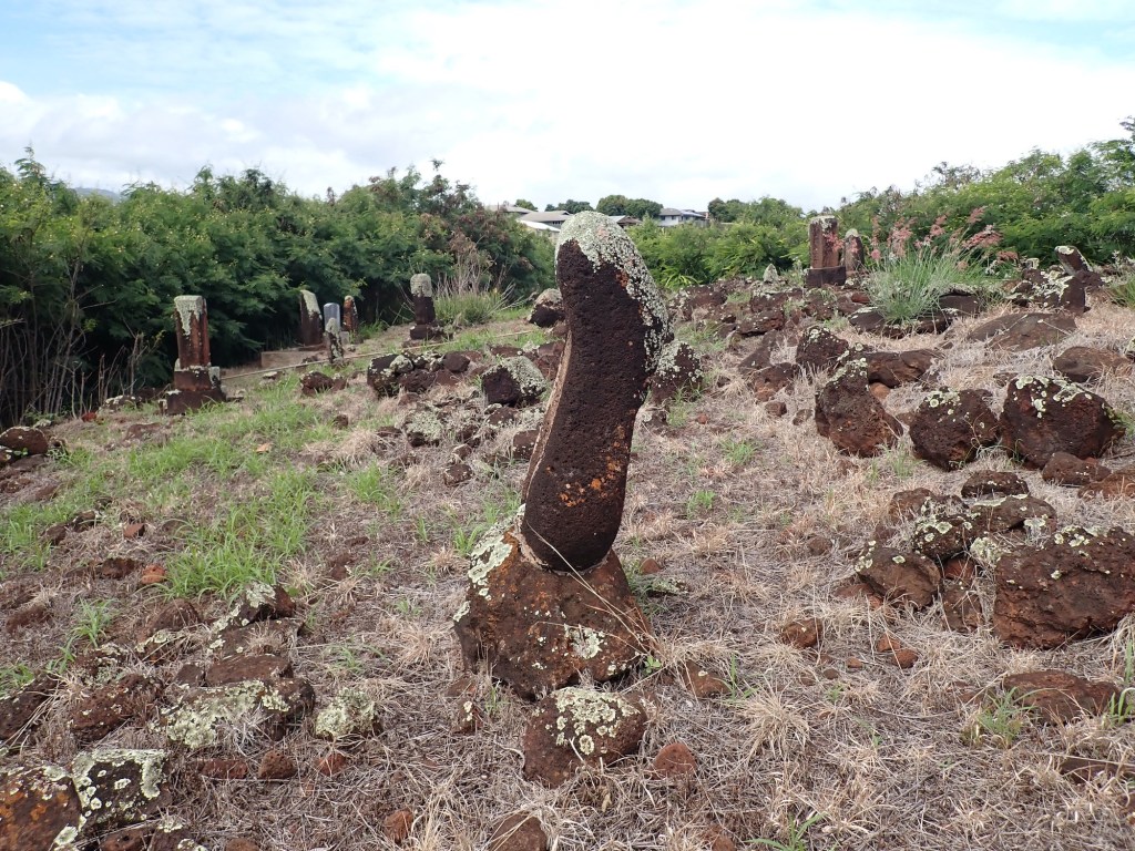 Many graves were marked by a frame of volcanic rocks which seemed too small to indicate the size of a human body. Many of the headstones were simple, uncarved volcanic rocks and monoliths. Some rough-hewn, some not. Some marked, many unmarked. If you want to indicate a grave using available natural materials, this is the way to do it.