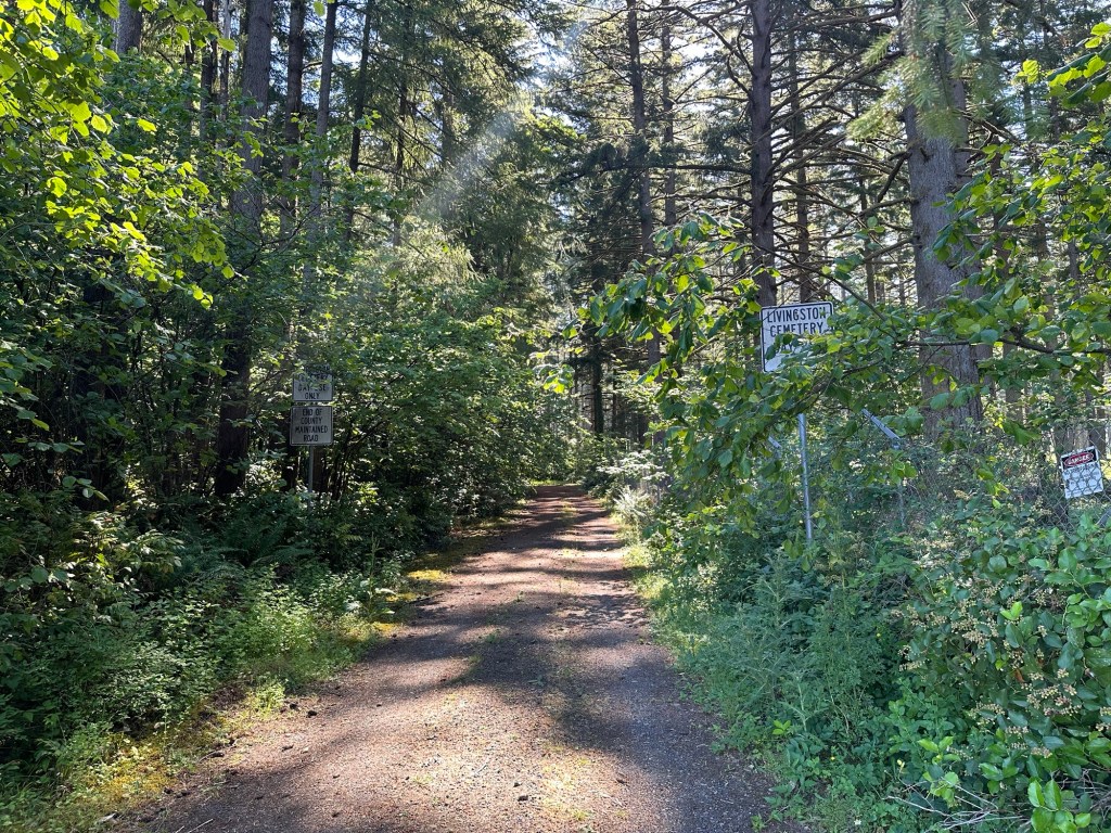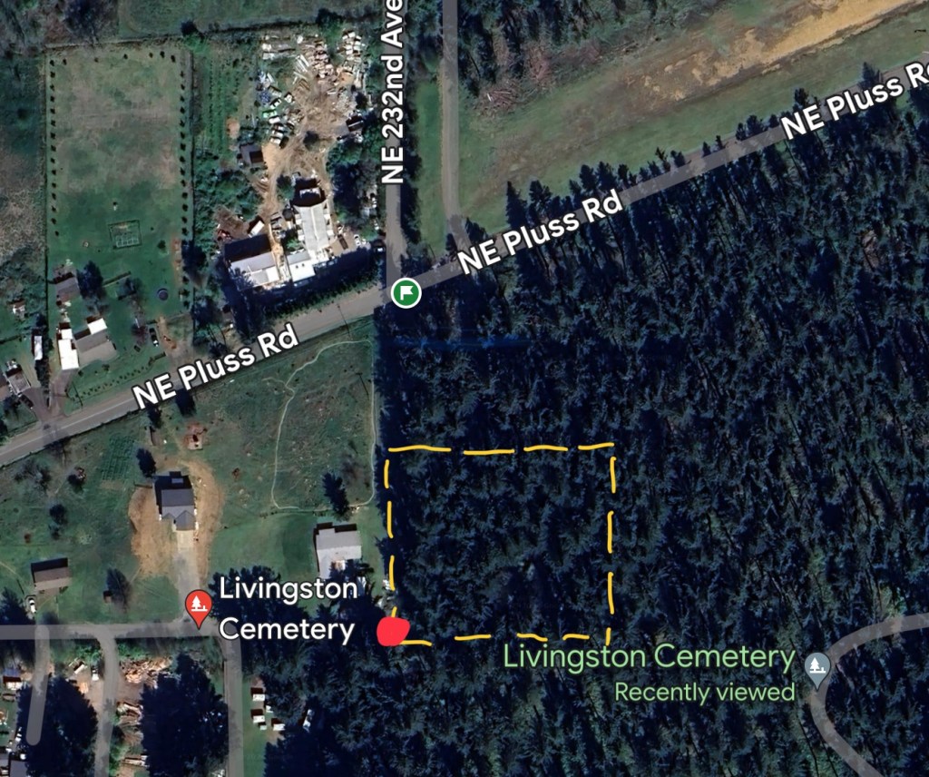 The Livingston cemetery is in the approximate location of the yellow dashed square on this screenshot from Google Maps. The red dot is the approximate location of the end of the driveway. The cemetery isn’t accessed from Pluss Road.