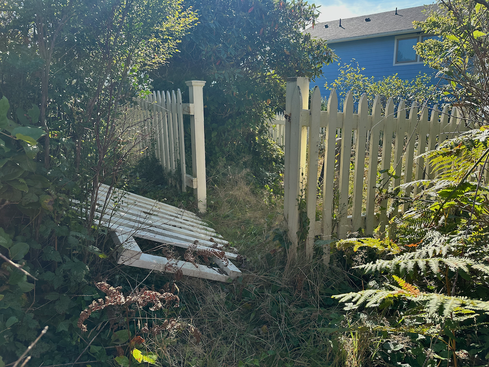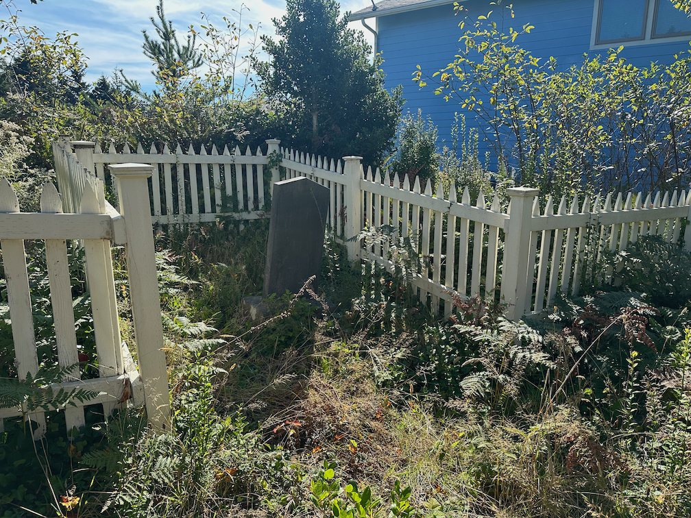 On my day trip, I found the location easily — it’s hard to miss giant water tanks. I could tell where the cemetery should have been, but all I saw was blackberries. Finally I pulled off to the side of a driveway and caught a glimpse of white in the middle of the jungle. That must be the picket fence!